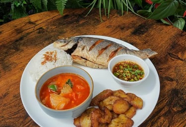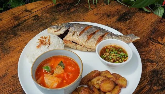Dorade sauce tamarin aigre-doux, oignon, servie avec riz